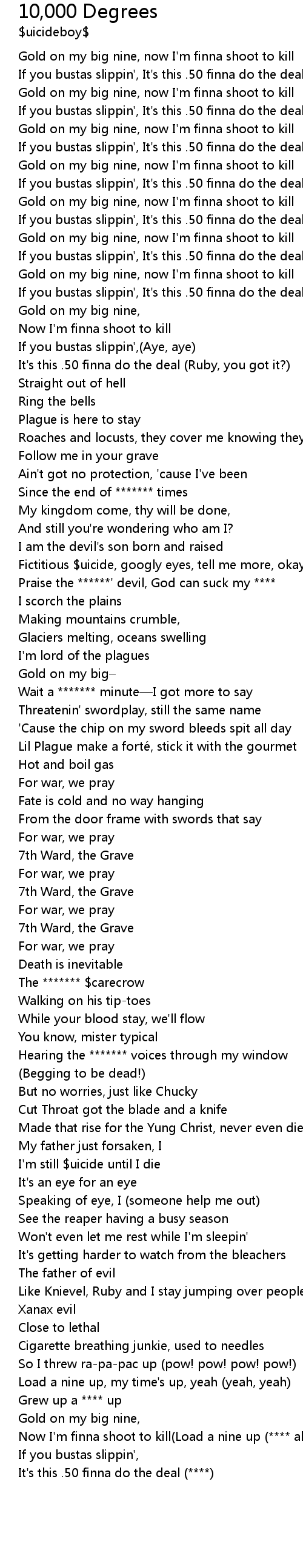 | [01:06.73] | Praise the ******' devil, God can suck my **** |