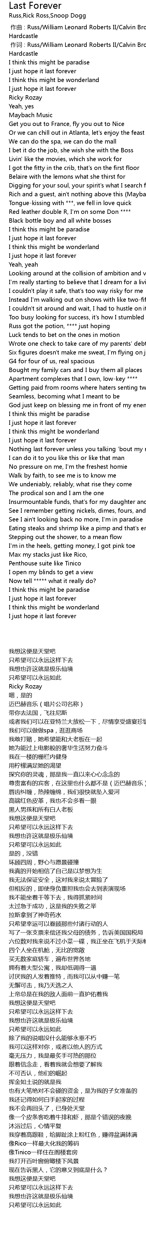 | [00:46.36] | Rich and a guest, ain' t nothing above this Maybach Music |