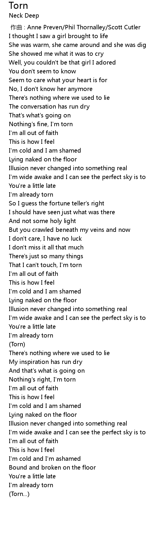 | [00:49.70] | Nothing' s fine, I' m torn |