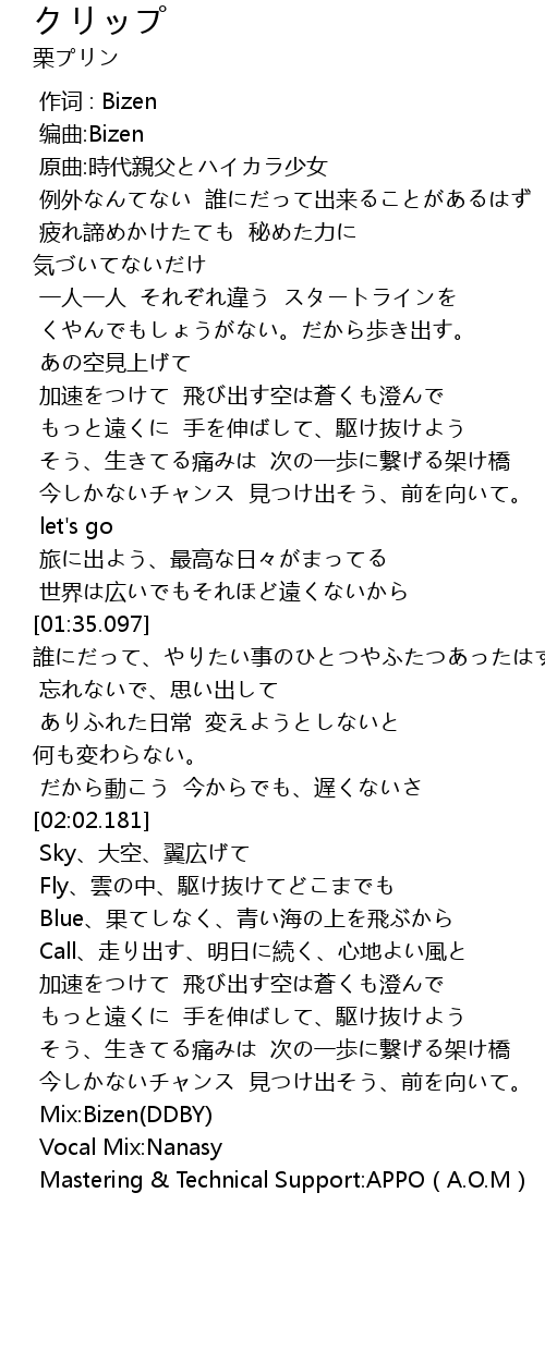 | [02:35.657] | Fly、雲の中、駆け抜けてどこまでも |