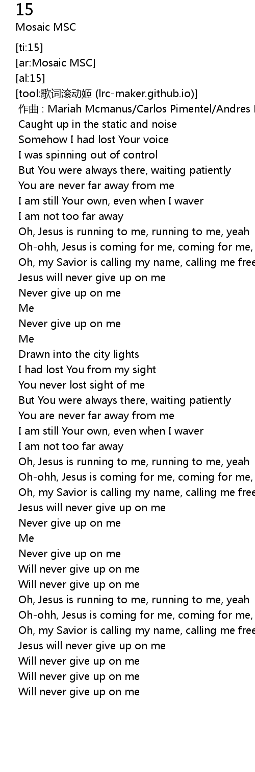 | [02:16.614] | Oh, Jesus is running to me, running to me, yeah |