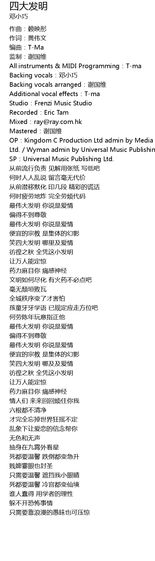 | [00:02.69] | OP: Kingdom C Production Ltd admin by Media Asia Music Publishing Ltd. Wyman admin by Universal Music Publishing Ltd. |