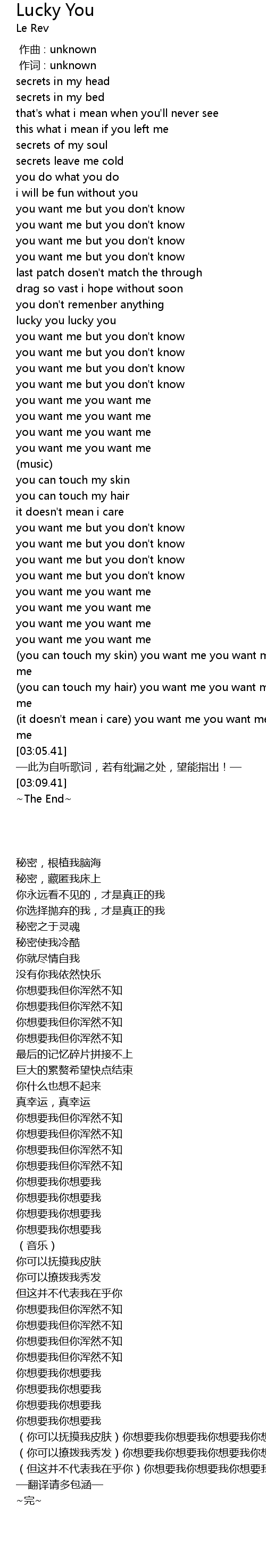 | [02:41.87] | (你可以抚摸我皮肤)你想要我你想要我你想要我你想要我 |