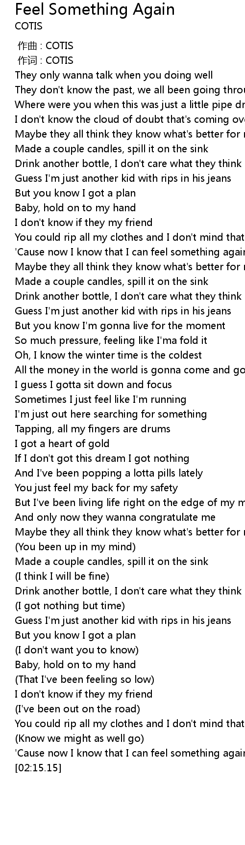 | [02:12.23] | ' Cause now I know that I can feel something again |