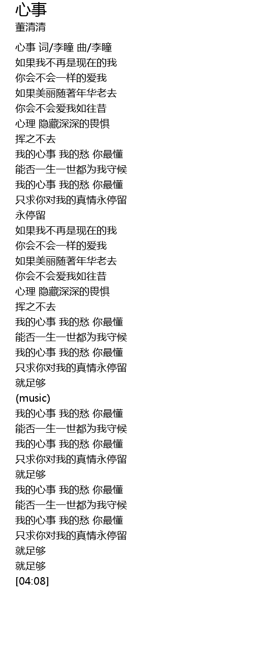 | [00:00] | 心事 词/李瞳 曲/李瞳 |