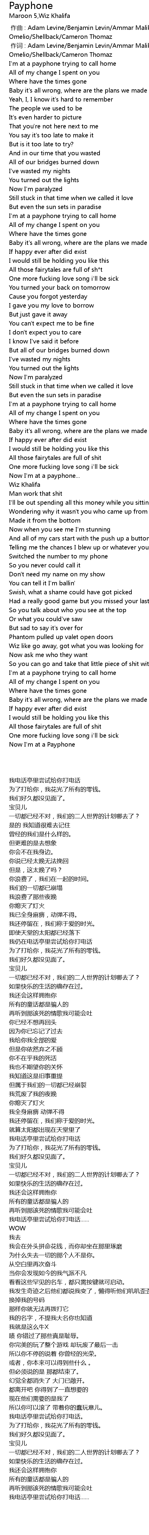 | [00:00.360] | zuo ci : Adam Levine Benjamin Levin Ammar Malik Dan Omelio Shellback Cameron Thomaz |