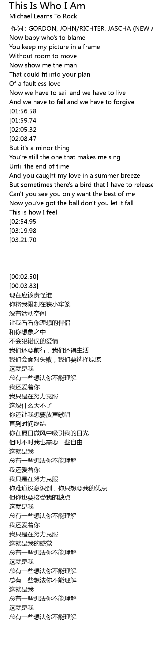 | [02:33.24][01:56.58][00:57.67] | This is who I am |