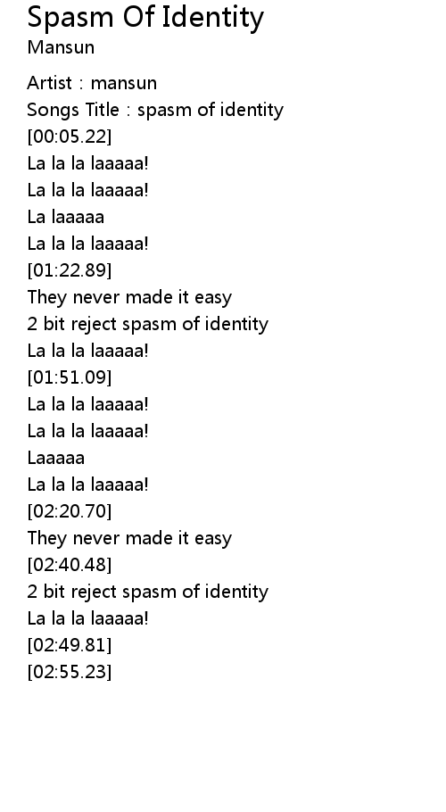 | [00:02.54] | Songs Title: spasm of identity |