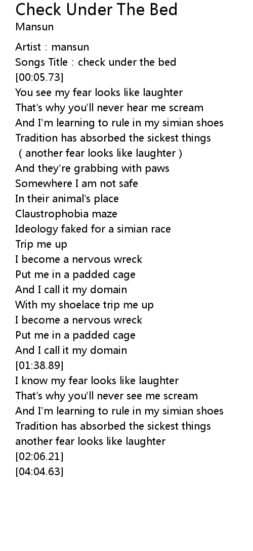 | [00:02.16] | Songs Title:check under the bed |