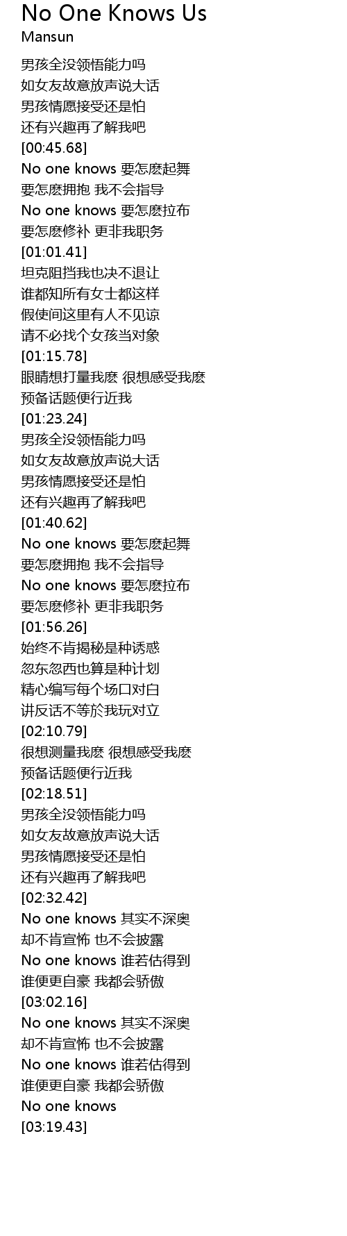 | [00:54.66] | No one knows yào zěn mó lā bù |