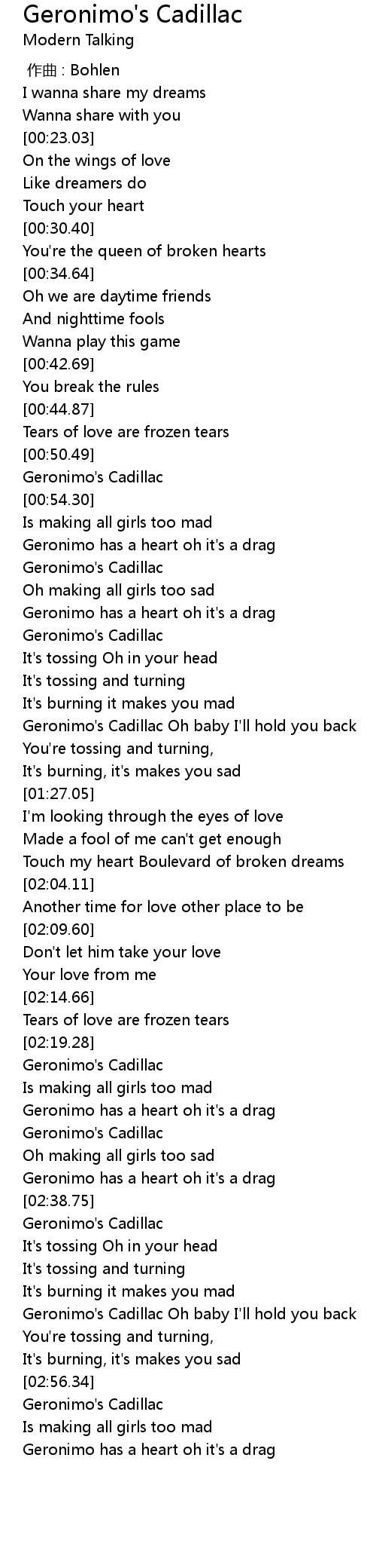 | [02:47.98] | Geronimo's Cadillac Oh baby I'll hold you back |