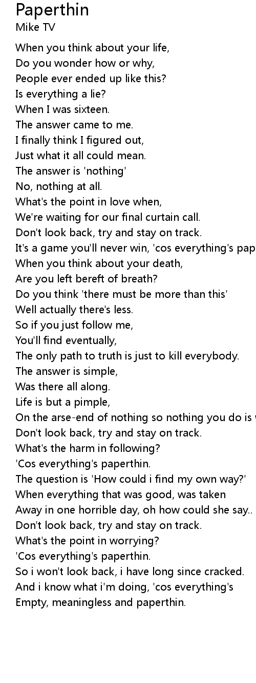 | [02:22.000] | 'Cos everything's paperthin. |