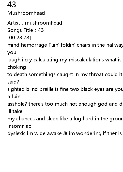 | [00:32.78] | mind hemorrage Fuin' foldin' chairs in the hallway crucified paralyzed you |