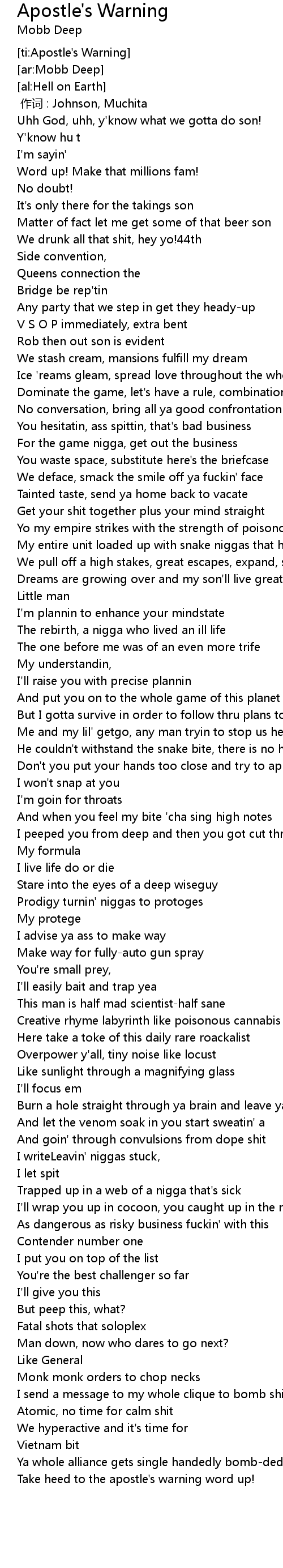 | [01:09.29] | Yo my empire strikes with the strength of poisonous snakes |