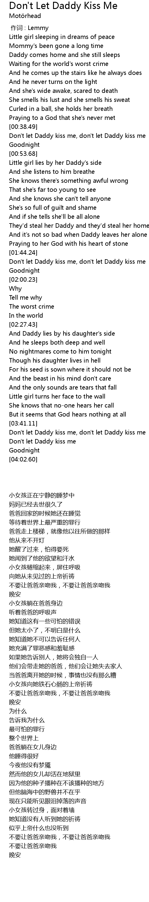 | [01:47.74] | Don' t let Daddy kiss me, don' t let Daddy kiss me |