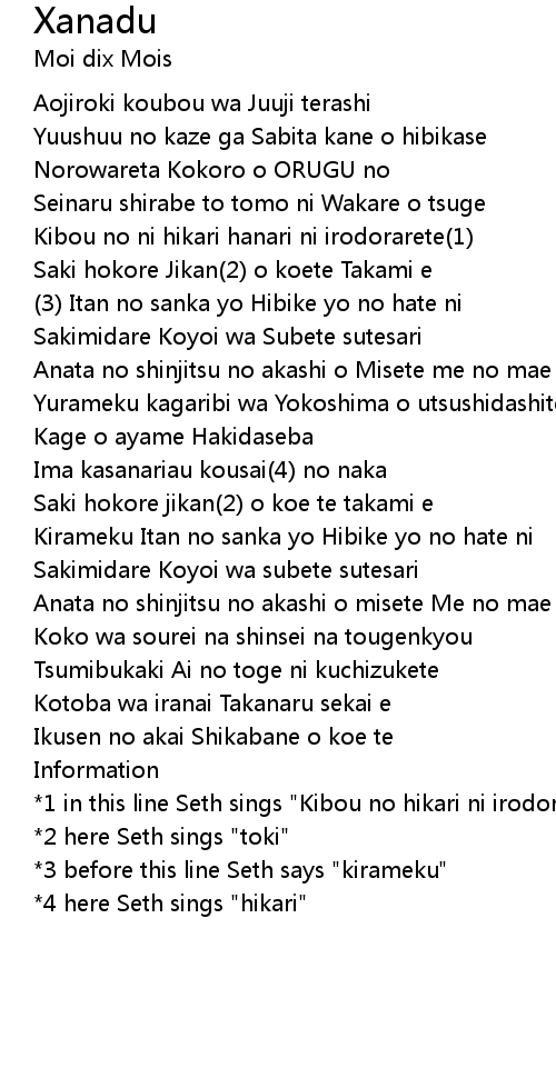 *1 in this line Seth sings "Kibou no hikari ni irodorarete" |