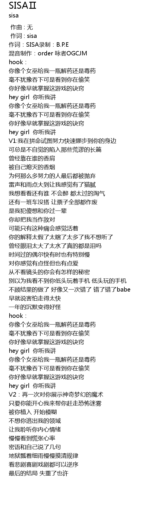 | [00:07.89] | 作词:SISA录制:B.P.E |