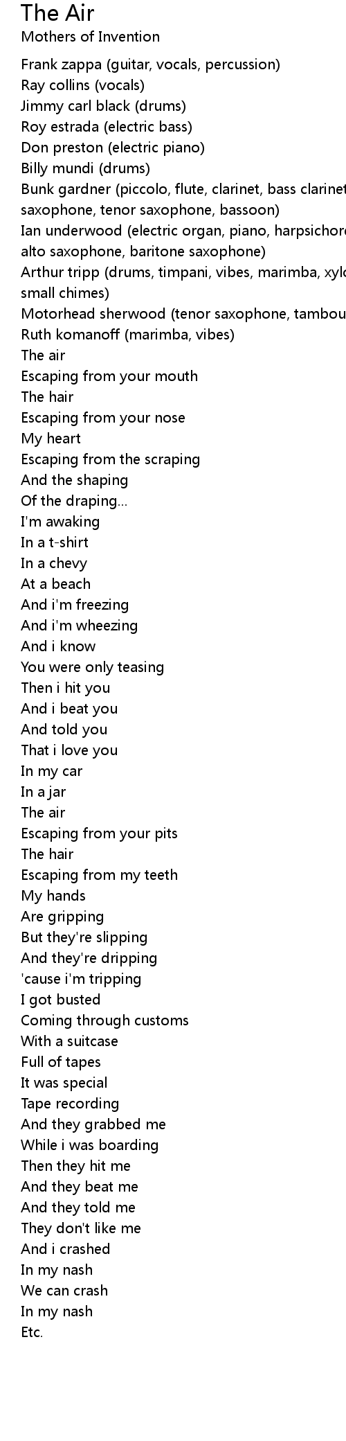 Frank zappa (guitar, vocals, percussion) |