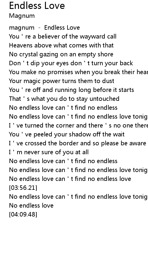 | [03:56.93] | No endless love can t find no endless love tonight |