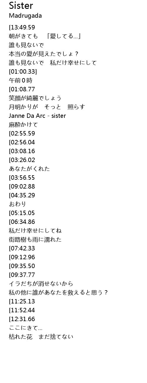 | [00:55.39] | 誰も見ないで 私だけ幸せにして |