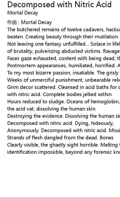| Destroying the evidence. Dissolving the human skin. Destroying the evidence. Decomposed with nitric acid. Dying, hideously, | |