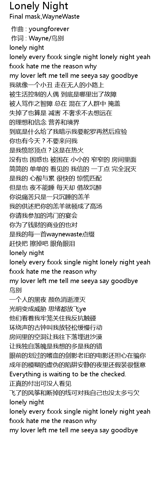 | [00:18.635] | lonely every fxxxk single night lonely night yeah |