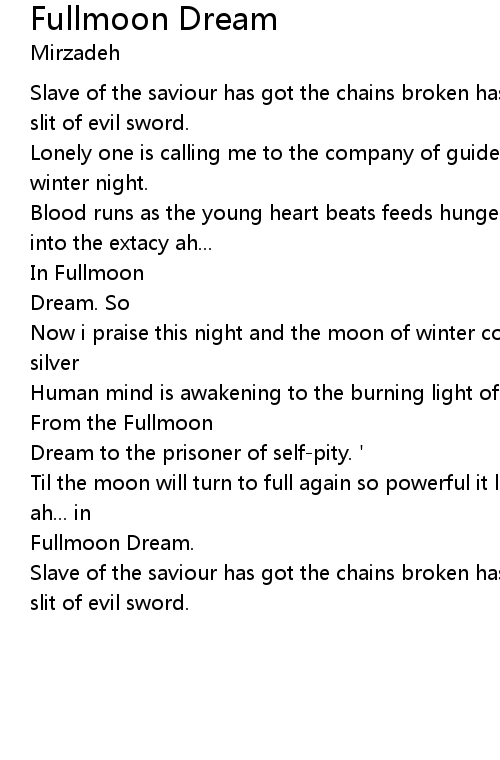 Til the moon will turn to full again so powerful it leads me into the extacy ah... in |
