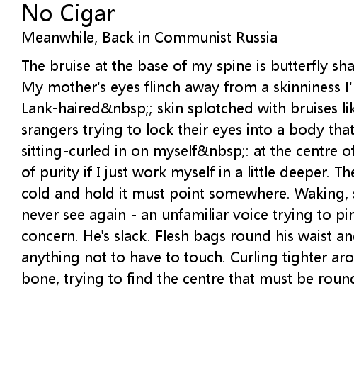 The bruise at the base of my spine is butterfly shaped, dressed and downstairs. My mother's eyes flinch away from a skinniness I'm obvlious to. Lank-haired ; skin splotched with bruises like split wine. Some few drunken srangers trying to lock their eyes into a body thats slowly disappearing, sitting-curled in on myself : at the centre of this, there must be a sort of purity if I just work myself in a little deeper. The bones that catch the cold and hold it must point somewhere. Waking, snared in the limbs of someone I never see again - an unfamiliar voice trying to pin me down with sleep-fuzzed concern. He's slack. Flesh bags round his waist and I'm repelled, I'd do anything not to have to touch. Curling tighter around a hunger that cuts to the bone, trying to find the centre that must be round here somewhere. |