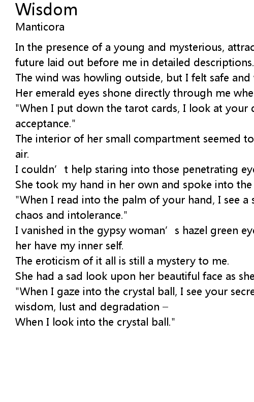 | I vanished in the gypsy woman' s hazel green eyes couldn' t resist to let her have my inner self. | |