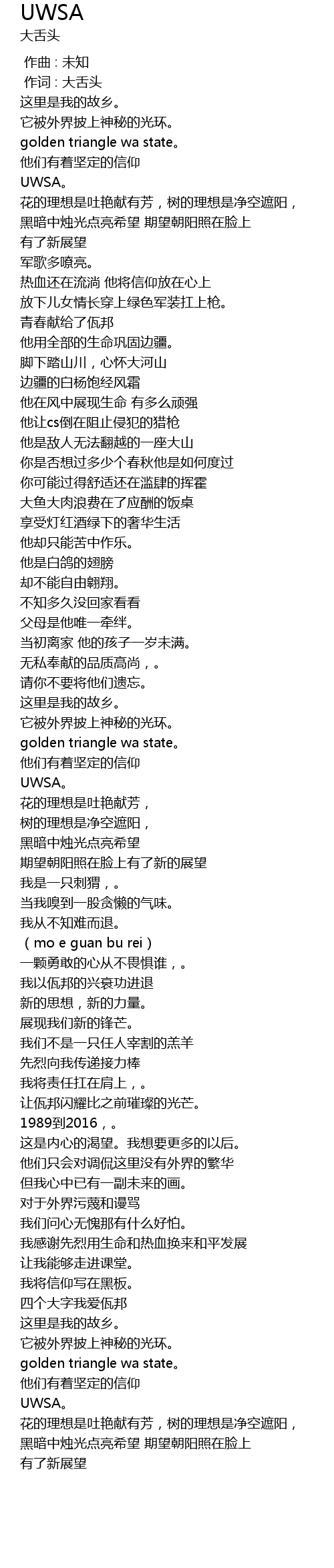 | [04:30.873] | 四个大字我爱佤邦 |