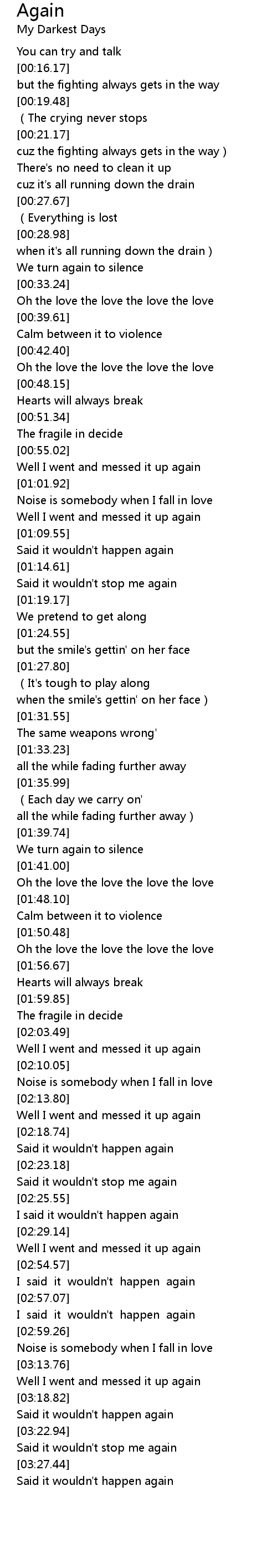 | [03:21.45] | Said it wouldn't happen again |