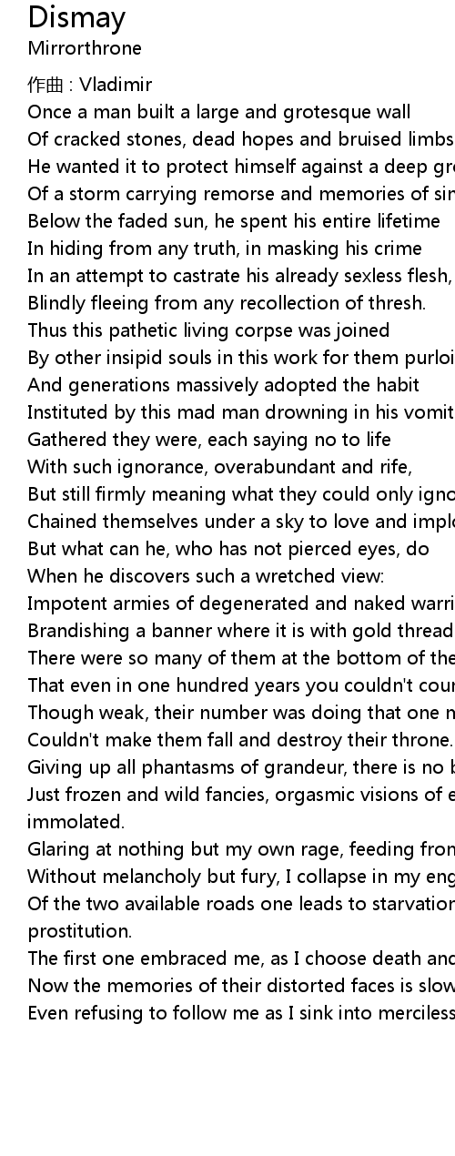 | Without melancholy but fury, I collapse in my engrieved fate. | |