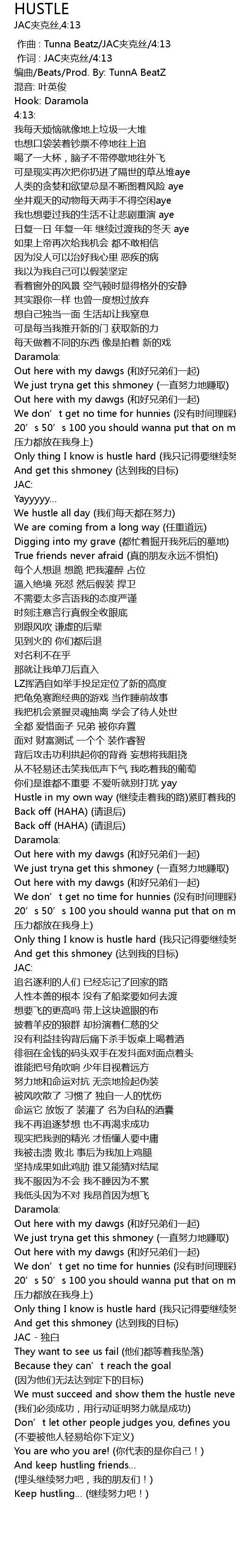 | [02:48.503] | Only thing I know is hustle hard wǒ zhǐ jì de yào jì xù nǔ lì |