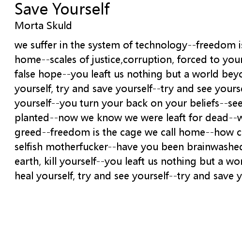 we suffer in the system of technology--freedom is the cage we all call home--scales of justice,corruption, forced to your knees--by dreams built on false hope--you leaft us nothing but a world beyond repair--try and heal yourself, try and save yourself--try and see yourself, save yourself--save yourself--you turn your back on your beliefs--sees of the future now planted--now we know we were leaft for dead--we suffer in the system of fuckin' greed--freedom is the cage we call home--how can you turn your back on me--you selfish motherfucker--have you been brainwashed or don't you care--save the earth, kill yourself--you leaft us nothing but a world beyond repair--try and heal yourself, try and see yourself--try and save yourself, save yourself. |