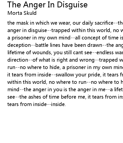 the mask in which we wear, our daily sacrifice--the mask you hide behind, the anger in disguise--trapped within this world, no where to run--no where to hide, a prisoner in my own mind--all concept of time is lost, walls of deception--battle lines have been drawn--the anger in you is the anger in me--a lifetime of wounds, you still cant see--endless wars now prevail, as you lose direction--of what is right and wrong--trapped within this world, no where to run--no where to hide, a prisoner in my own mind--the ashes of time before me, it tears from inside--swallow your pride, it tears from inside--inside--trapped within this world, no where to run--no where to hide, a prisoner within my own mind--the anger in you is the anger in me--a lifetime of wounds, you still cant see--the ashes of time before me, it tears from inside--swallow your pride, it tears from inside--inside. |