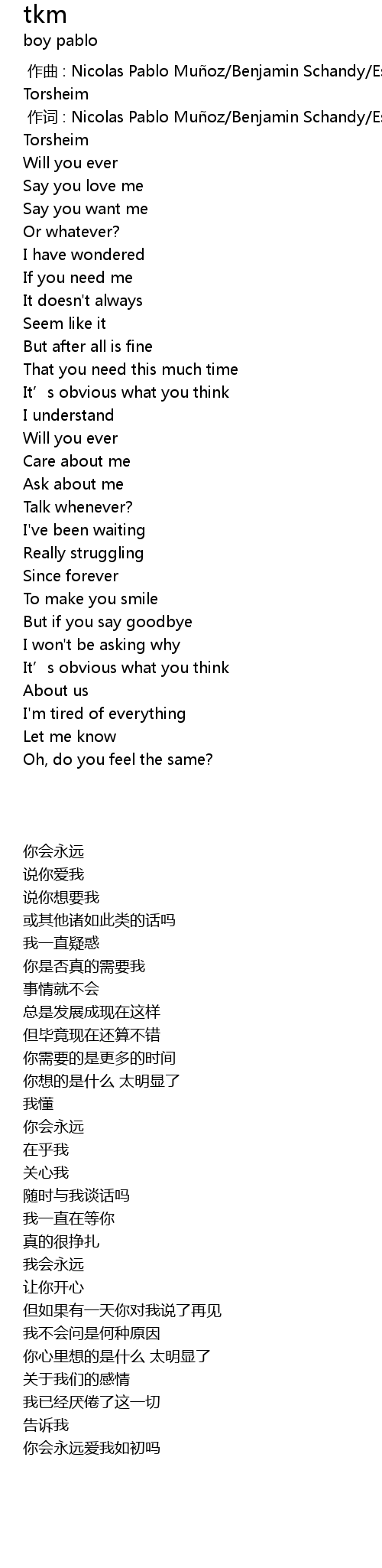 | [00:01.000] | 作词 : Nicolas Pablo Muñoz/Benjamin Schandy/Esteban Muñoz/Erik Torsheim |