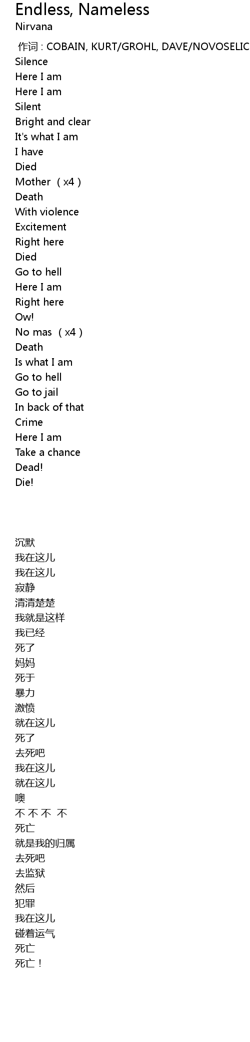 | [00:00.00] | 作词 : COBAIN, KURT/GROHL, DAVE/NOVOSELIC, KRIST |