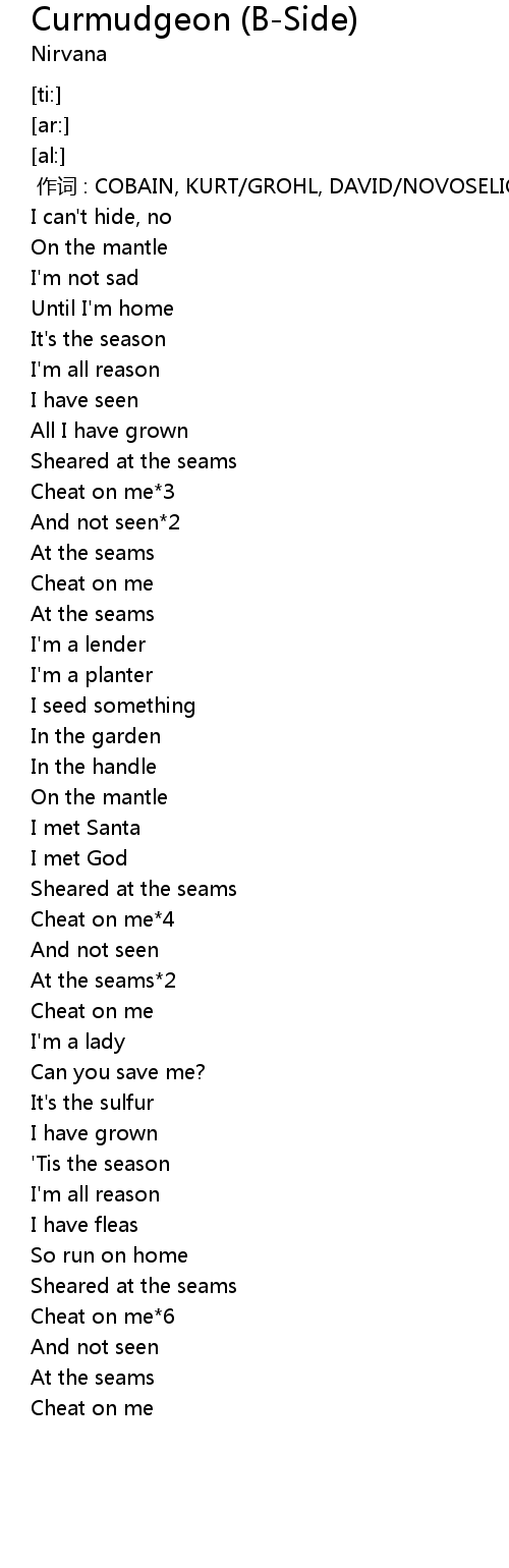 | [00:00.00] | 作词 : COBAIN, KURT/GROHL, DAVID/NOVOSELIC, CHRIS |