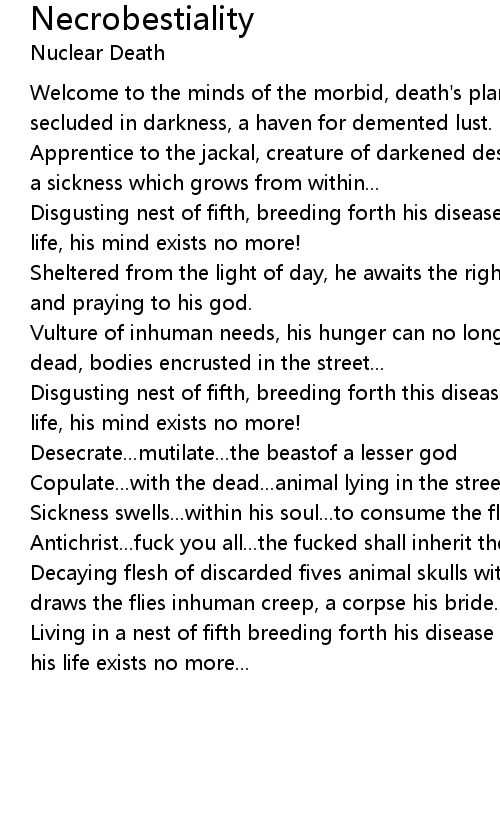 Decaying flesh of discarded fives animal skulls without eyes rancid stench it draws the flies inhuman creep, a corpse his bride... |