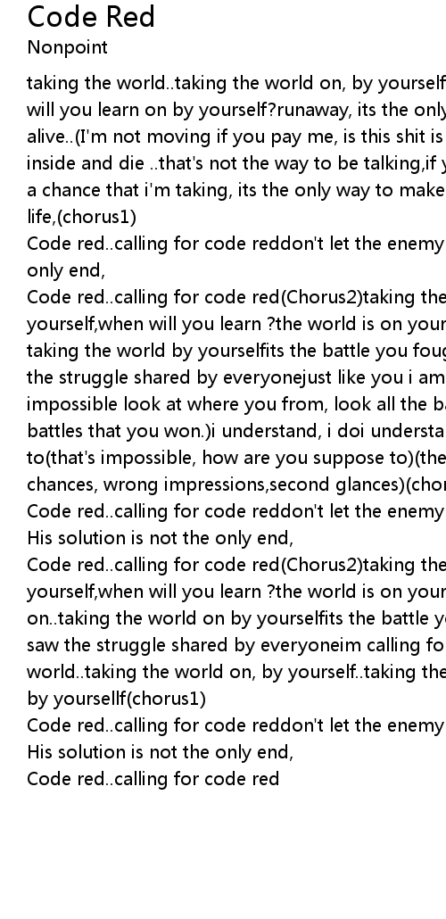 Code red..calling for code red(Chorus2)taking the world..taking the world on, by yourself,when will you learn ?the world is on your sidetaking the world on, taking the world by yourselfits the battle you fought and you wonwhen you saw the struggle shared by everyonejust like you i am, just like you i am(its impossible look at where you from, look all the battles i lost. Look at all battles that you won.)i understand, i doi understand like you're supposed to(that's impossible, how are you suppose to)(there's a million ways, second chances, wrong impressions,second glances)(chorus1) |