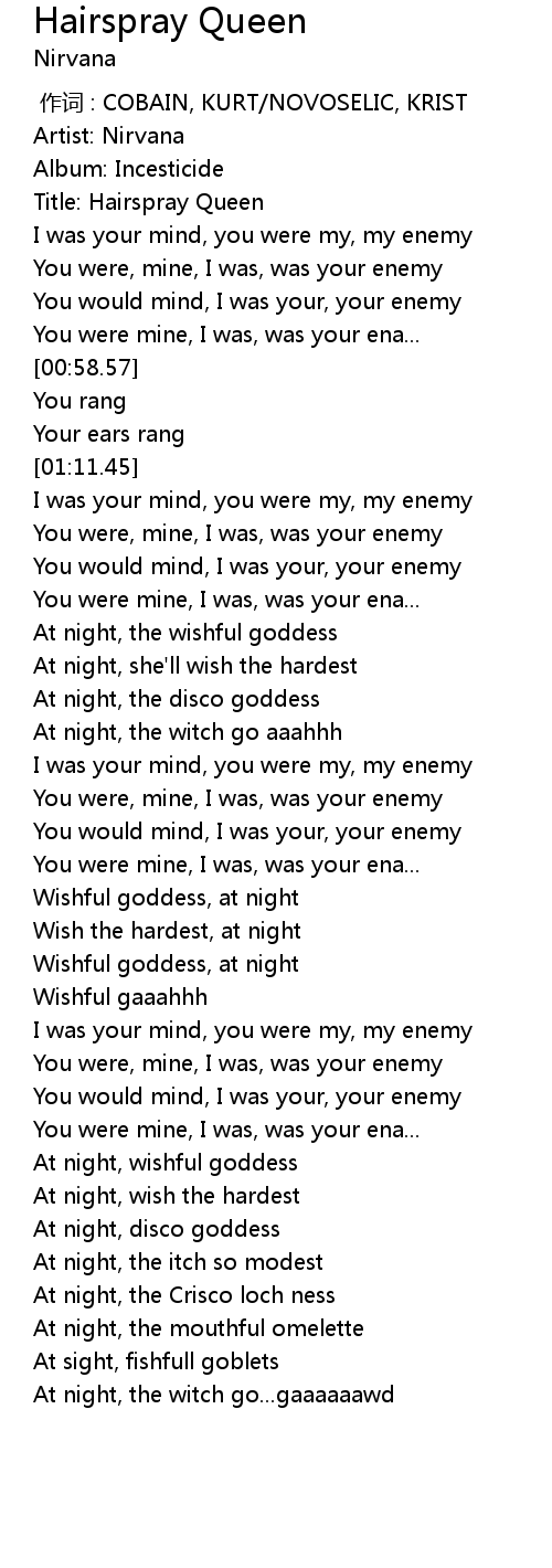 | [00:00.00] | 作词 : COBAIN, KURT/NOVOSELIC, KRIST |