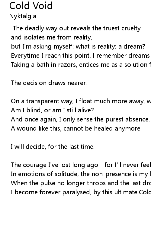 | Taking a bath in razors, entices me as a solution for my endless grief. | |