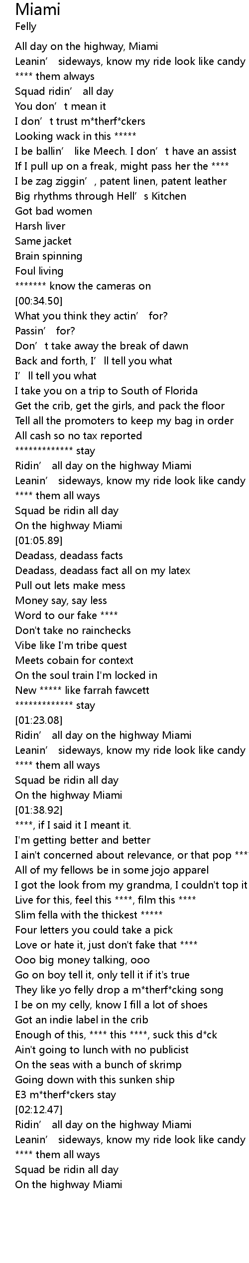 | [01:23.23] | Ridin’ all day on the highway Miami |