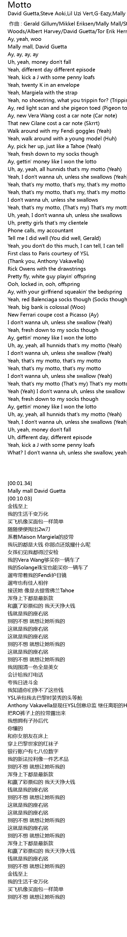 | [01:58.98] | Yeah, that' s my motto That' s my That' s my motto |