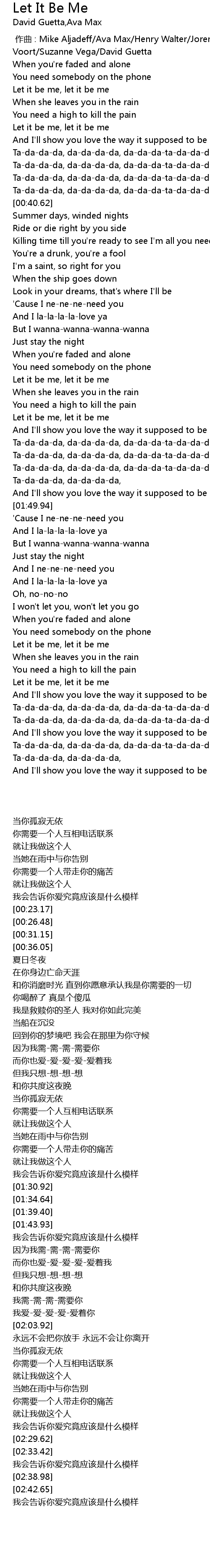 | [00:00.000] | zuò qǔ : Mike Aljadeff Ava Max Henry Walter Joren van der Voort Suzanne Vega David Guetta |