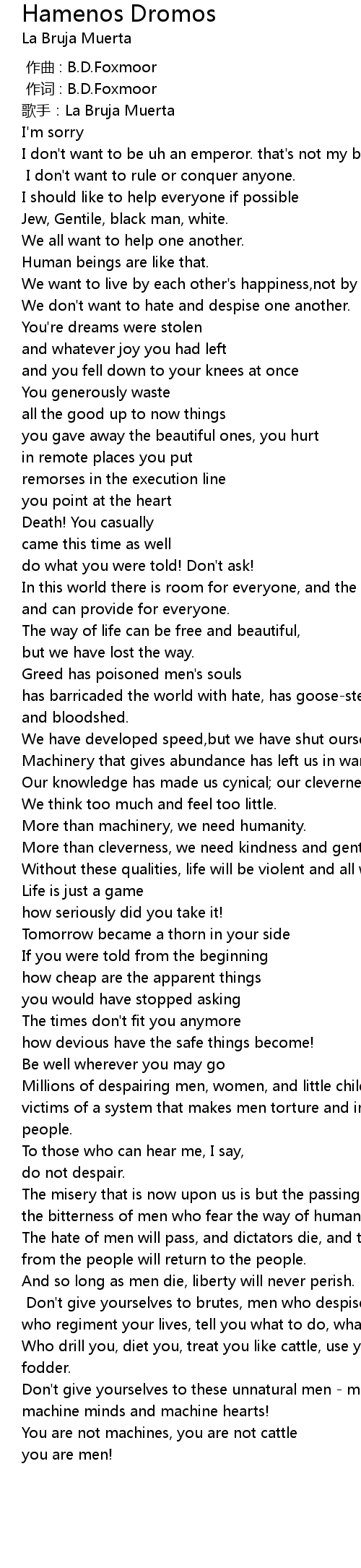 | [05:06.00] | Don' t give yourselves to brutes, men who despise you, enslave you who regiment your lives, tell you what to do, what to think and what to feel! |