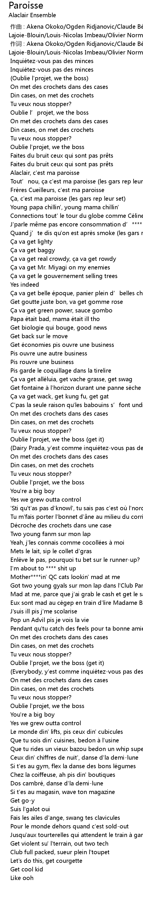 | [00:01.000] | 作词 : Akena Okoko/Ogden Ridjanovic/Claude Bégin/Emmanuel Lajoie-Blouin/Louis-Nicolas Imbeau/Olivier Normandin-Guénette |