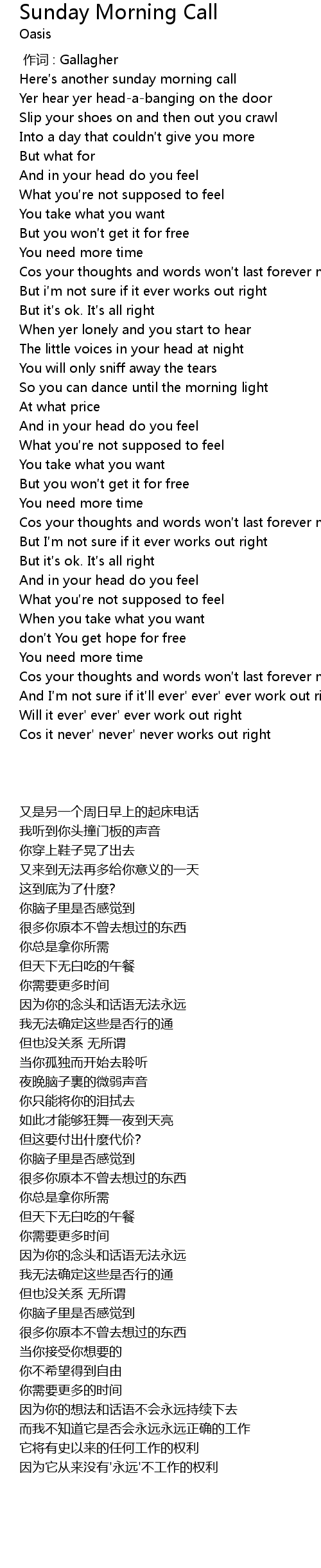 | [00:00.00] | Here s another sunday morning call |