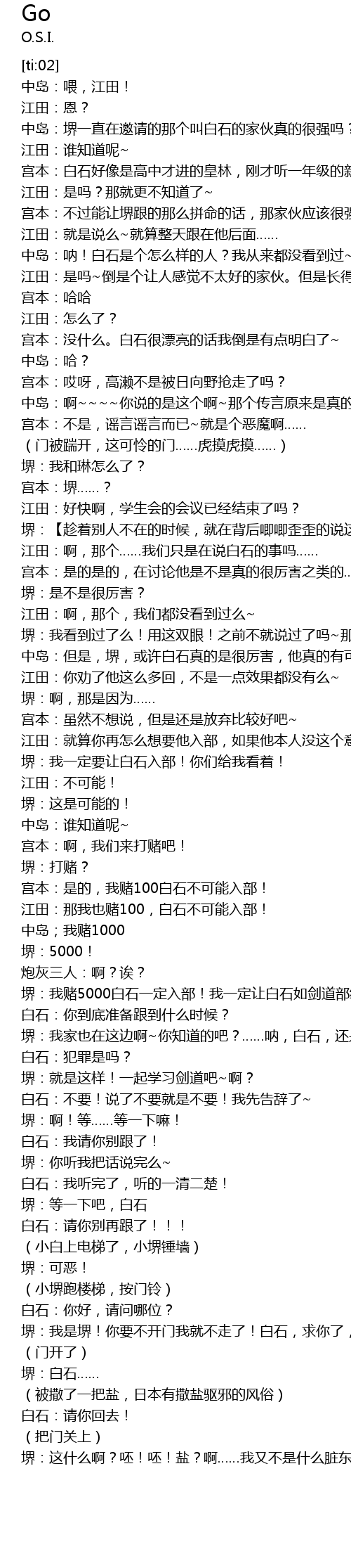 | [02:29.617] | 堺:我赌5000白石一定入部!我一定让白石如剑道部给你们! |