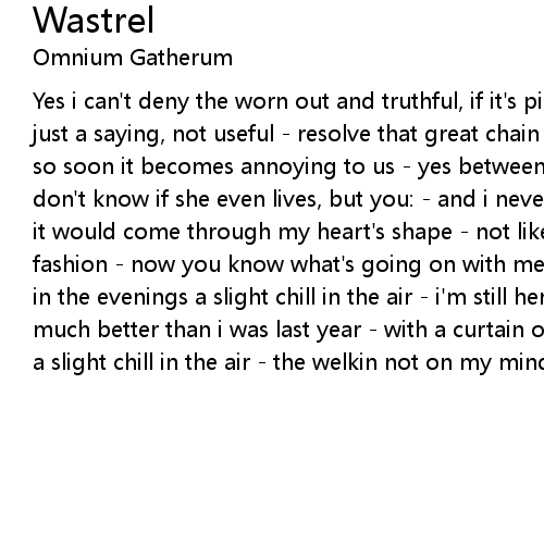 Yes i can't deny the worn out and truthful, if it's picturesque - though it's just a saying, not useful - resolve that great chain of aging and fierce hours - so soon it becomes annoying to us - yes between her thighs it was nothing - i don't know if she even lives, but you: - and i never was in need of touch unless it would come through my heart's shape - not like they who say it in today's fashion - now you know what's going on with me - trying to steal the light - and in the evenings a slight chill in the air - i'm still here breathing, feeling so much better than i was last year - with a curtain of smoke - and in the evenings a slight chill in the air - the welkin not on my mind, nor anything it covers |